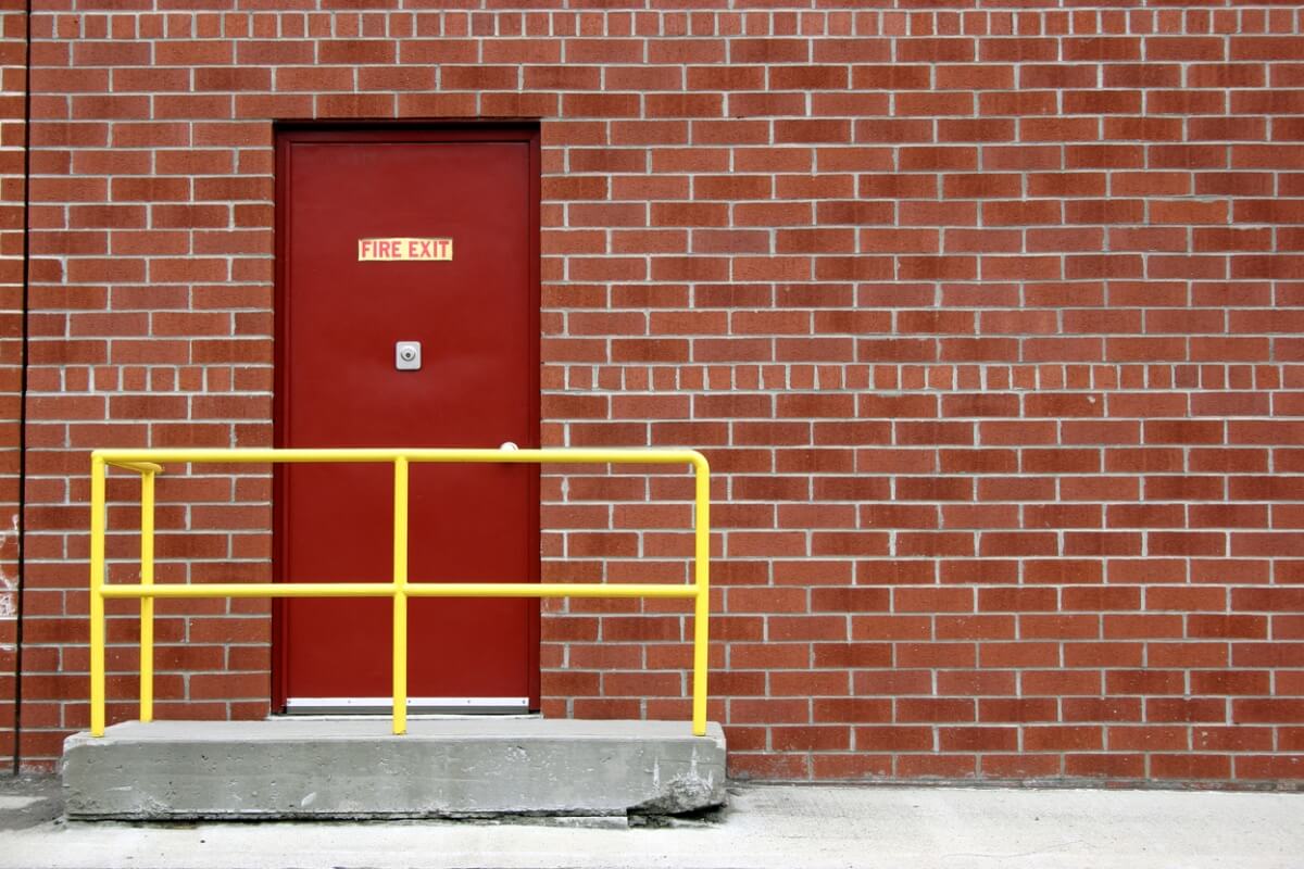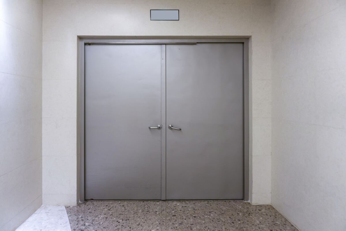 Each fire-rated door is labeled with its rating on essential components such as the hinge, door panel, and frame.